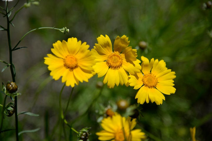 Golden “bitterweed” is a name I found when I looked up its name for a story I wrote a few years ago. However I just discovered it’s actually coreopsis, which fits it much better, so I guess it’s good I updated the story and changed the time to August when the coreopsis has gone. Of course, its common name is “large-flowered tickseed,” which reminds me of grisly names like “spotted dead nettle” and “lungwort,” two of my favorite ground covers back in Michigan. Ah well, we can’t name them all! I thought the red clover was Indian paintbrush for the longest time, and just enlightened my friend Emily on that one last week. She’d thought the same thing. I mean, it looks like a paintbrush!