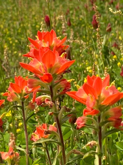 As I gazed, I pondered the right words to describe the colors. I think “coral” when I see the Indian paintbrush, though “vermillion” is a lovely word, too, and apt.